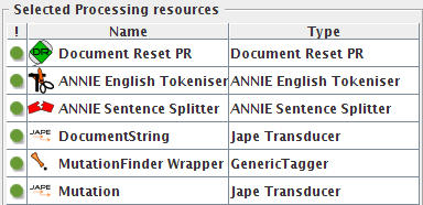 Now we can execute MutationFinder on this string and then collect the output, which will be stored as a single GATE annotation. So, you have to create a GenericTagger PR, and set the following run-time parameters: