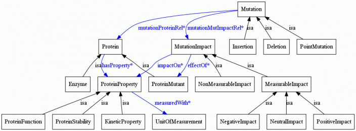 The OMM ontology is implemented in the standard Web Ontology Language (OWL) format. It formally models concepts and their relations in the mutation analysis domain, providing semantic knowledge during the text mining process. For example, the restrictions placed on possible slot fillers for a specific protein property allows to filter out erroneous value assignments during the analysis process, thereby improving overall precision.